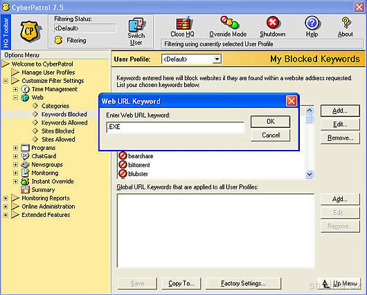 CyberPatrol monitoruje internetovou aktivitu, filtruje webové stránky dle zadaných kritérií nebo dle automaticky aktualizovaného seznamu, blokuje diskusní skupiny, poštu přístupnou přes webové stránky, příchozí a odchozí chat, časově omezí přístup k internetu.