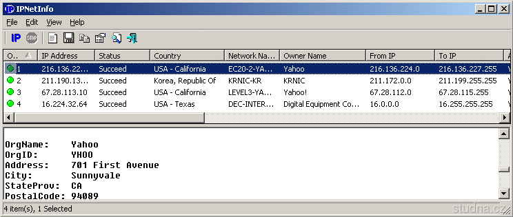 Utilitka umožňující snadné vyhledání dostupných informací o dané IP adrese: vlastníka adresy, název země/státu, rozsah IP adres, kontaktní informace a další.
