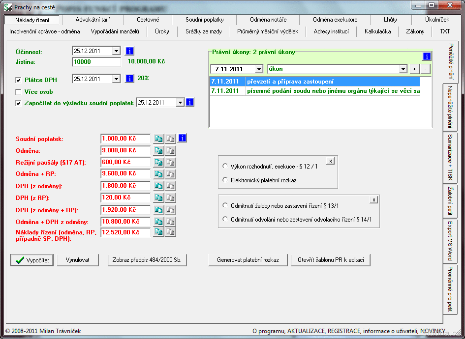 Parametry programu Prachy na cestě - advokátní kalkulačka 3.15