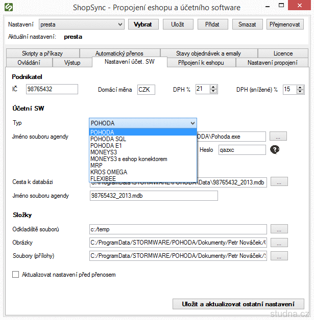 ShopSync je aplikace umožňující jednoduché propojení eshopu založeného na některé z open-source platforem - Prestashop, Opencart, Virtuemart či WooCommerce a účetního software - Pohoda, Pohoda SQL či Pohoda E1, Money S3, nebo MRP.